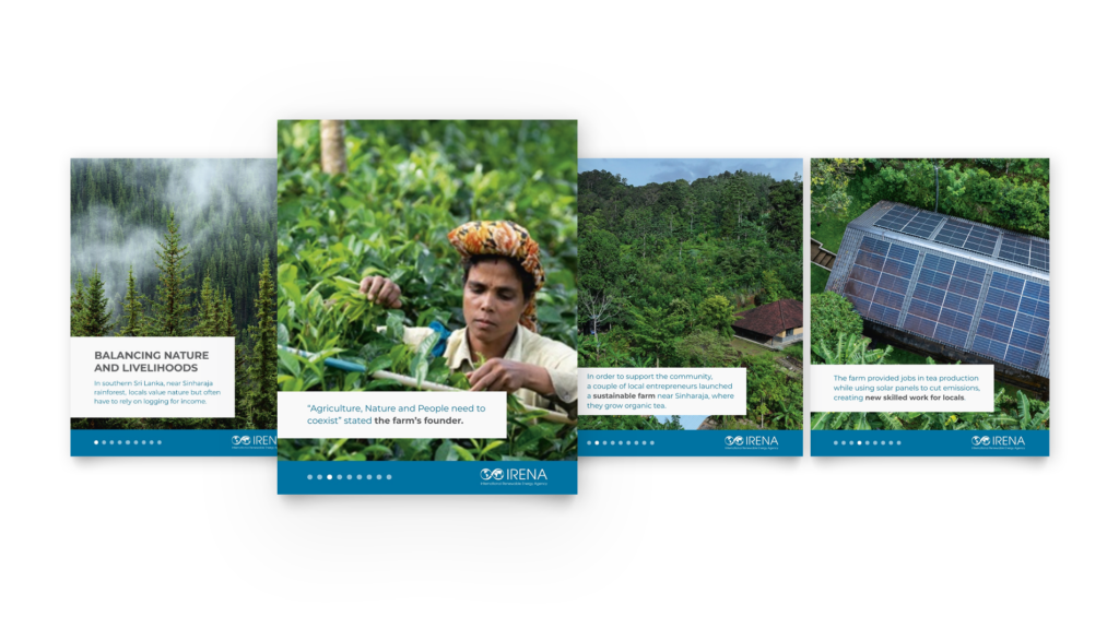 The assignment included ongoing strategic guidance on social media activities, ensuring continuous alignment with IRENA’s priorities and campaign objectives. Strategic recommendations and trainings were provided for the creation of new content and visual assets whenever suitable, responding to emerging communication needs.