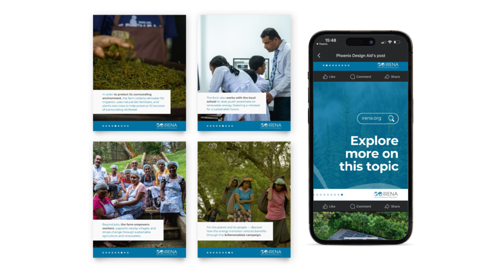 In parallel, Phoenix Design Aid supported IRENA’s paid social media campaigns as well as the development of a podcast format, offering strategic guidance on content direction, thematic coherence and amplification opportunities to reinforce campaign messaging.
