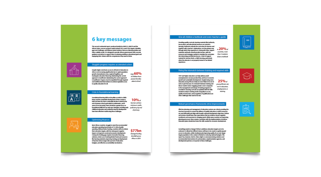 The final product serves as a high-value communication tool for continental stakeholders, helping inform policy, drive dialogue and promote the transformative vision of SDG 4 and CESA 16–25 across Africa.